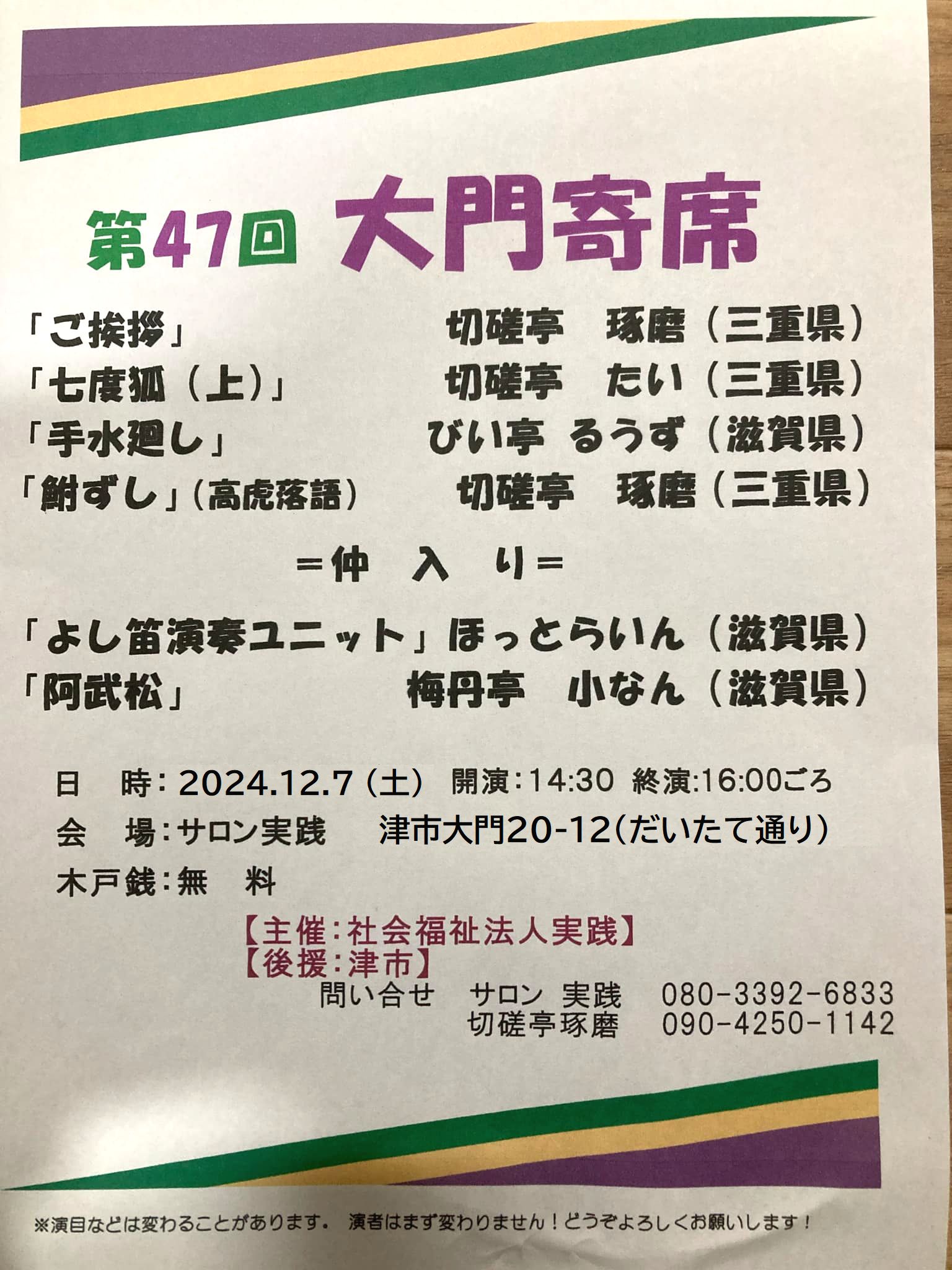 | ・Memo | 社会人落語家さんによる木戸銭無料の寄席の中でちょこっと演奏させていただきます。 場所:三重県津市大門20-12「サロン実践」 主催:社会福祉法人実践 後援:津市 問い合わせ サロン実践:080-3392-6833 切磋亭琢磨:090-4250-1142 |