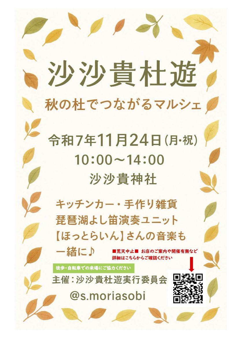 | ・Memo | ナンジャモンジャの木で有名な・・・いやいや、それより佐佐木一族の祖神を祀る古社として有名な、安土町の沙沙貴神社境内で開催されるマルシェ「沙沙貴杜遊(ささきもりあそび)」に、今年初めて出演させていただくことになりました。 ※“ほっとらいん”は10:30〜13:30の間、適当なタイミングで演奏をさせていただきます。 ※駐車台数に限りがありますので、出来る限り電車でお越しください。(JR安土駅から徒歩10分)もしお車で来られて駐車場が満車の場合は安土支所に駐めてください。(支所からは徒歩12分) |