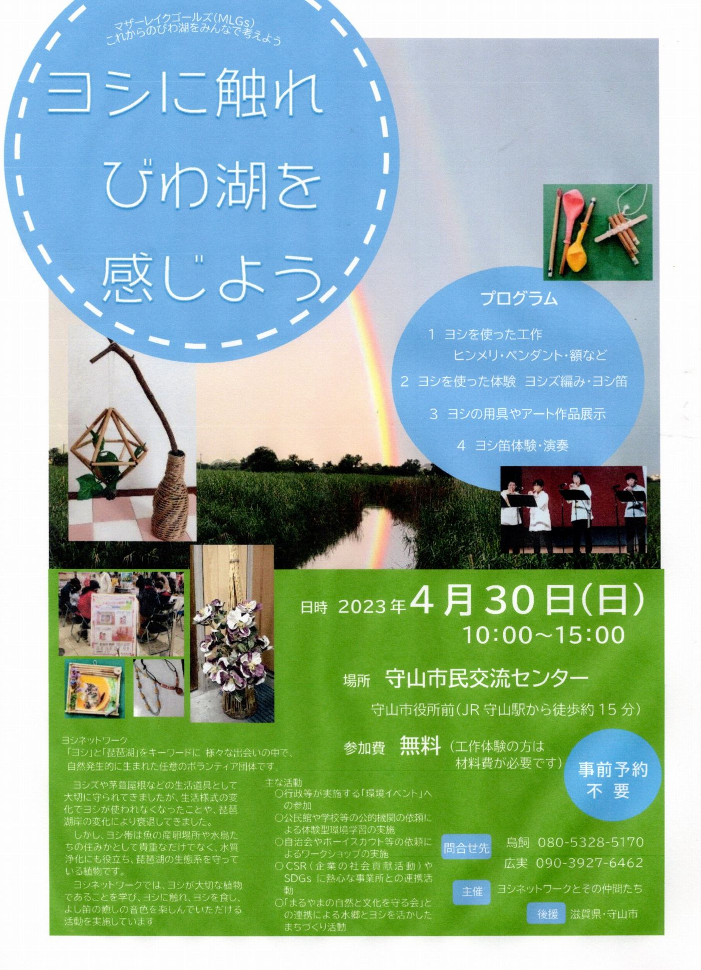 | 4月30日(日) | 10:00~ 15:00 | ○ | ヨシに触れ びわ湖を感じよう 守山市民交流センターにて開催 参加費無料です。 日曜日のひと時を、ヨシに触れてみてください。