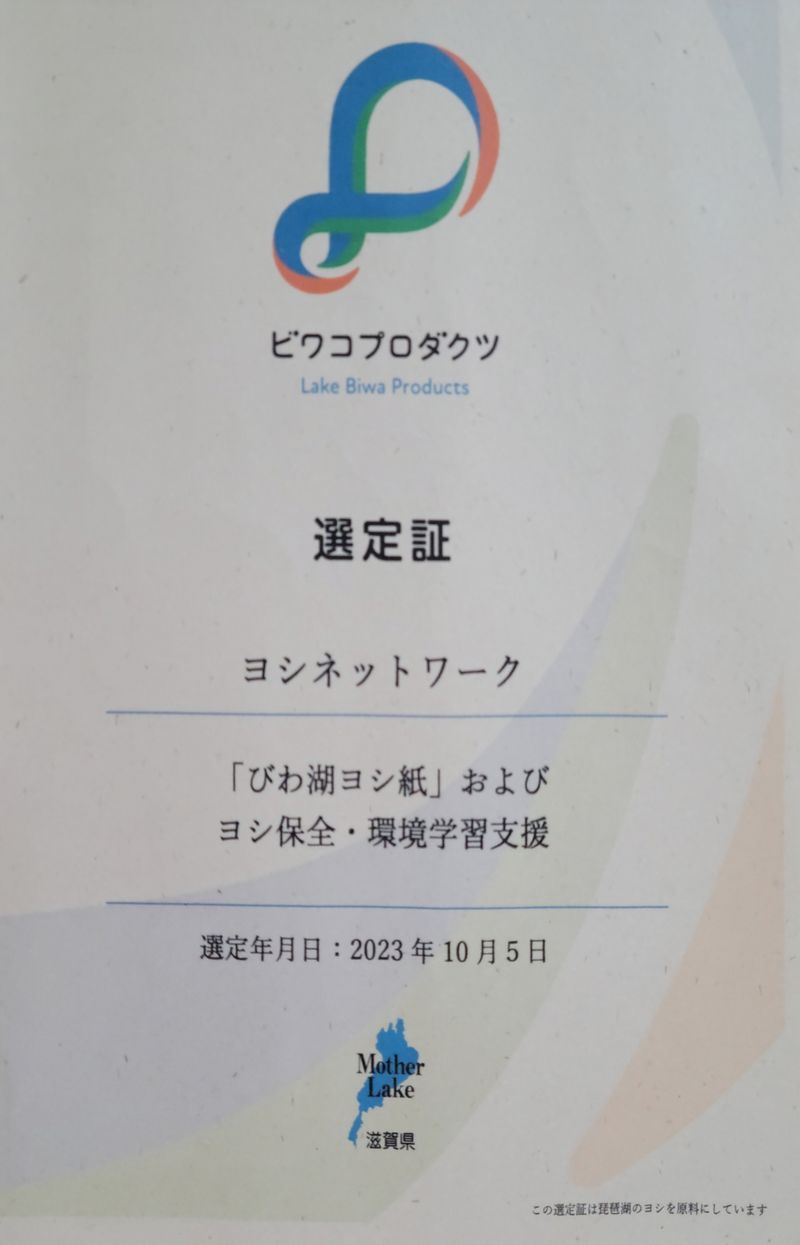 | ○ | ビワコプロダクツ選定書 滋賀県では、県内の企業等の水環境技術等の開発や国内外への展開等を促進するため、マザーレイクゴールズとの運動をもと「マザーレイクゴールズに向けたビワコプロダクツ」プロジェクトを実施しています。 その第2回選定委員会で当会の活動が「びわ湖ヨシ紙」およびヨシ保全・環境学習支援ということで、選定されました。